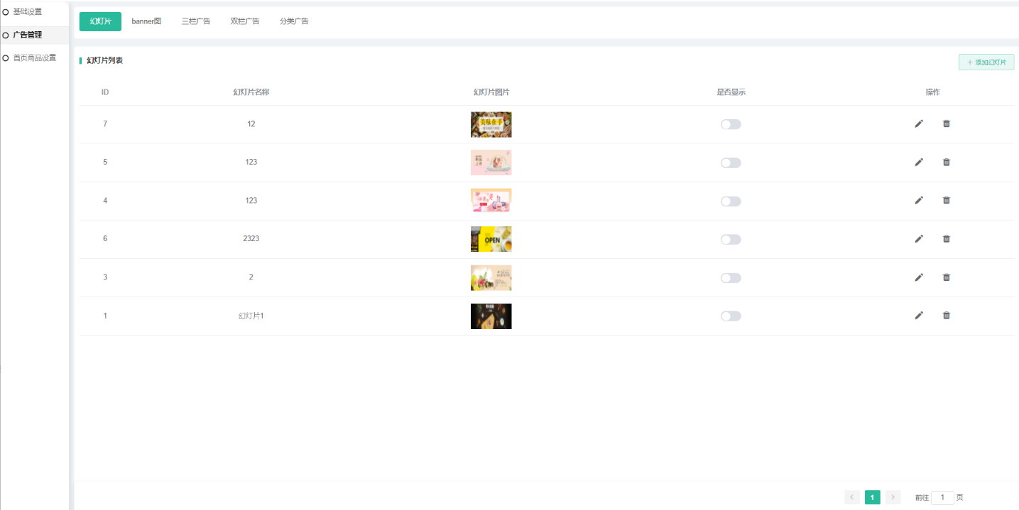 1、幻灯片:幻灯片创建ID,幻灯片名称、图片、是否显示、编辑或删除。