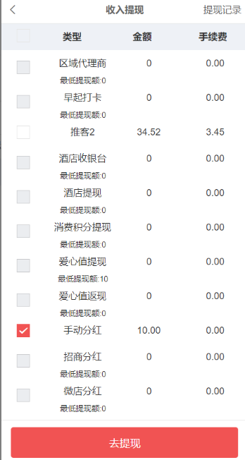 列表显示分红记录,操作查看备注信息和查看记录,点击手动分红可以创建新的分红。