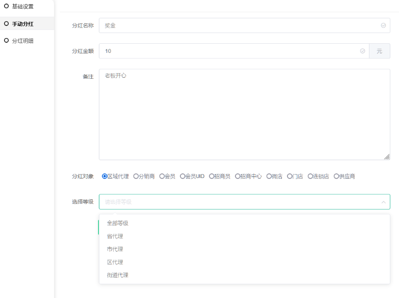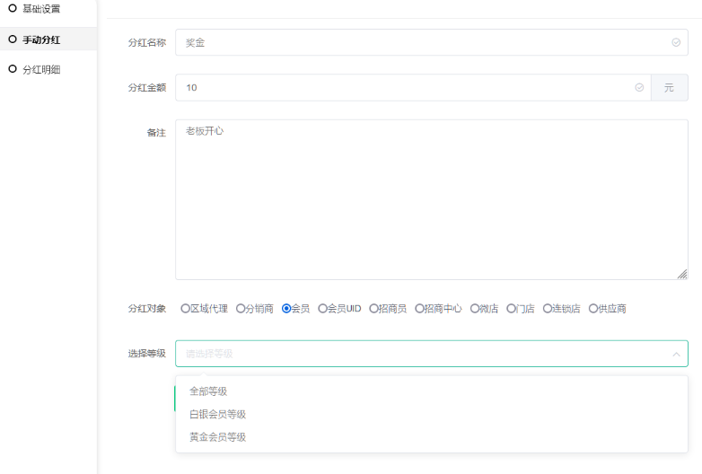 功能概述:给特定会员手动分红。注:给特定会员发放分红时需谨慎,请勿重复操作,发放分红若有延迟,刷新页面等大概2-5分钟观察即可。
