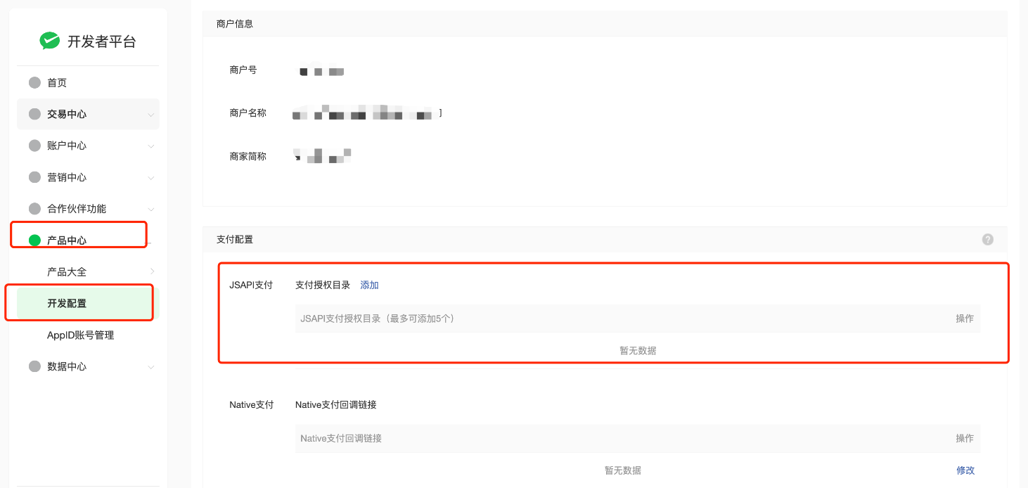1、路径:微信商户平台(pay.weixin.qq.com)-- 产品中心 -- 开发配置 -- 支付配置--JSAPI支付,添加支付授权目录。