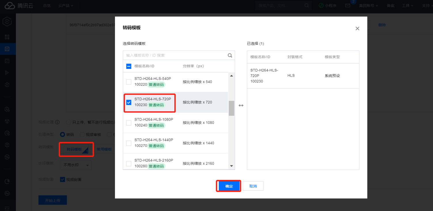 3.2.1在弹出的界面上选择转码模板注意只能选择“MP4开头”的转码方式,一般选择“MP4-720P 或 MP4-1080P” 就可以了,清晰度越高在播放时使用的流量越多,云点播平台的流量费用也会相应的增加