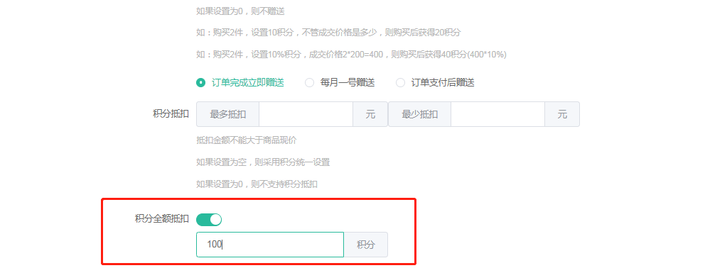 2.积分抵扣(可设置抵扣部分金额-可设置全额抵扣)