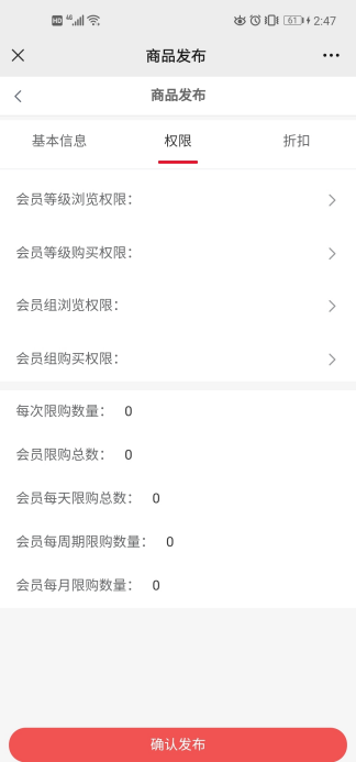 (5-2)权限:会员等级浏览权限、会员等级购买权限、会员组浏览权限、会员组购买权限、每次限购数量、会员限购总数、会员每天限购总数、会员每周期限购数量、会员每月限购数量