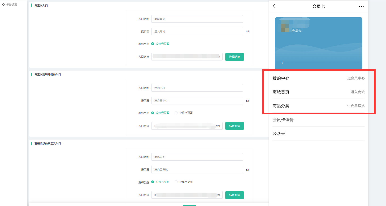 14、自定义入口:设置自定义入口名称和提示语,仅可以选择商城链接