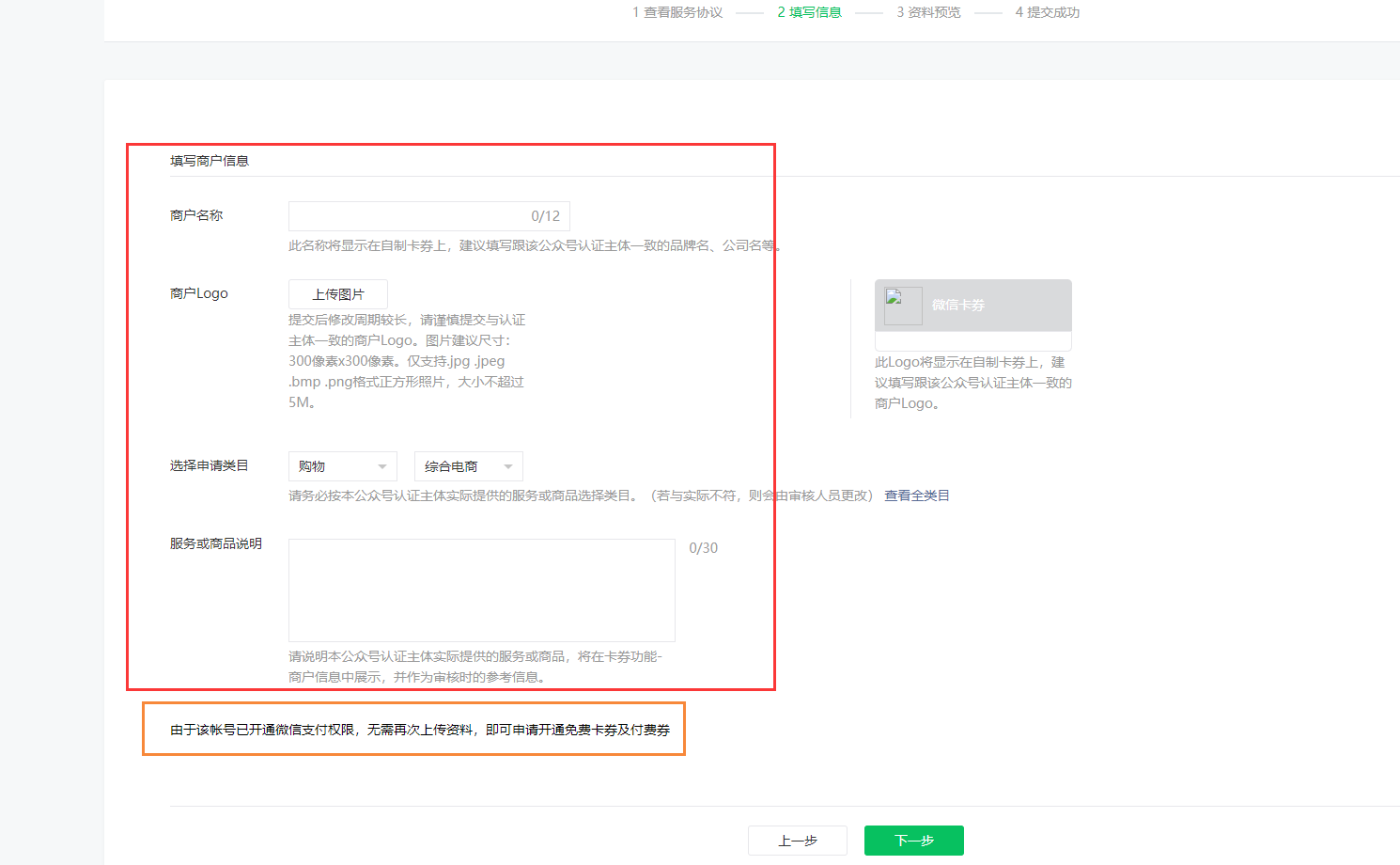 以下两点只要已开通微信支付权限,无需再次上传资料,可直接跳过,即可申请开通免费卡券及付费券,