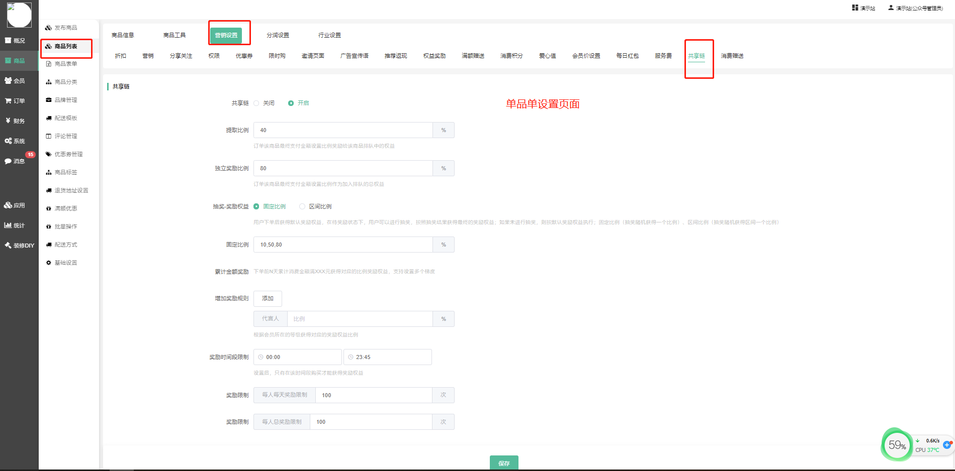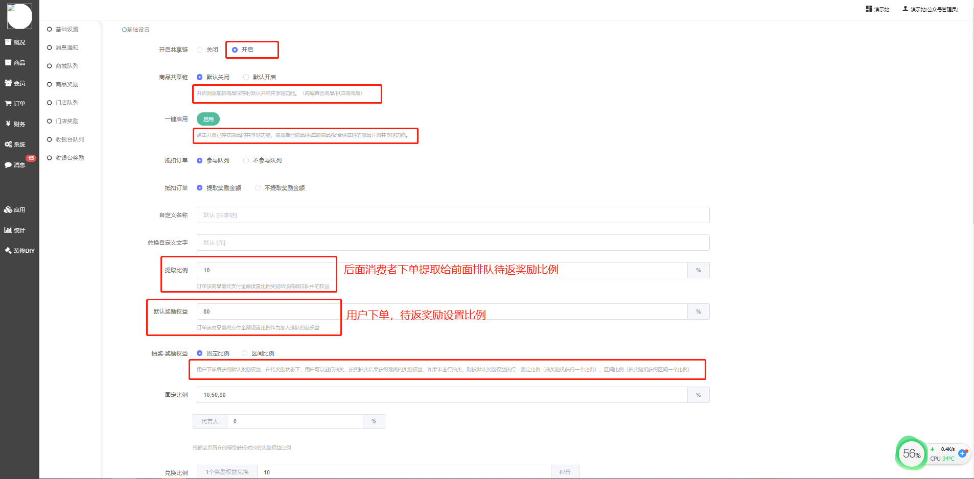(1)商家队列、商品队列奖励权益比例设置及计算优先级,按优先级先后顺序如下,如果优先级靠前的设置了,即取该比例,如果都没设置,取最后共享链插件设置的默认奖励权益比例