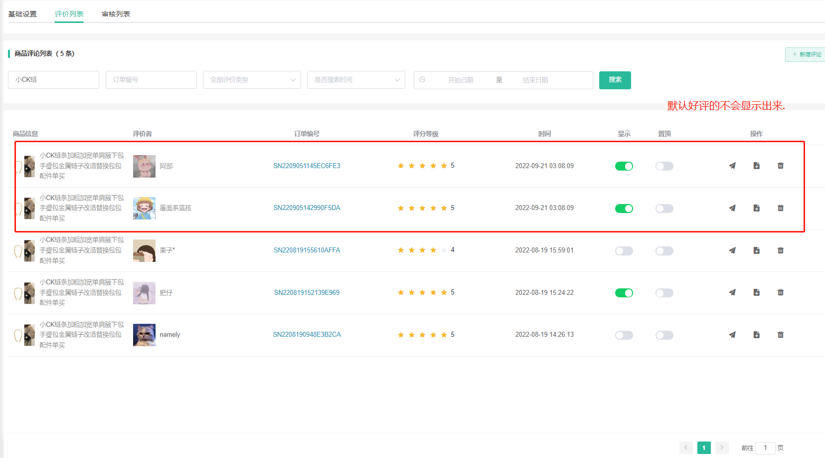 支持查看会员商品评价、是否通过审核、是否显示、是否置顶。