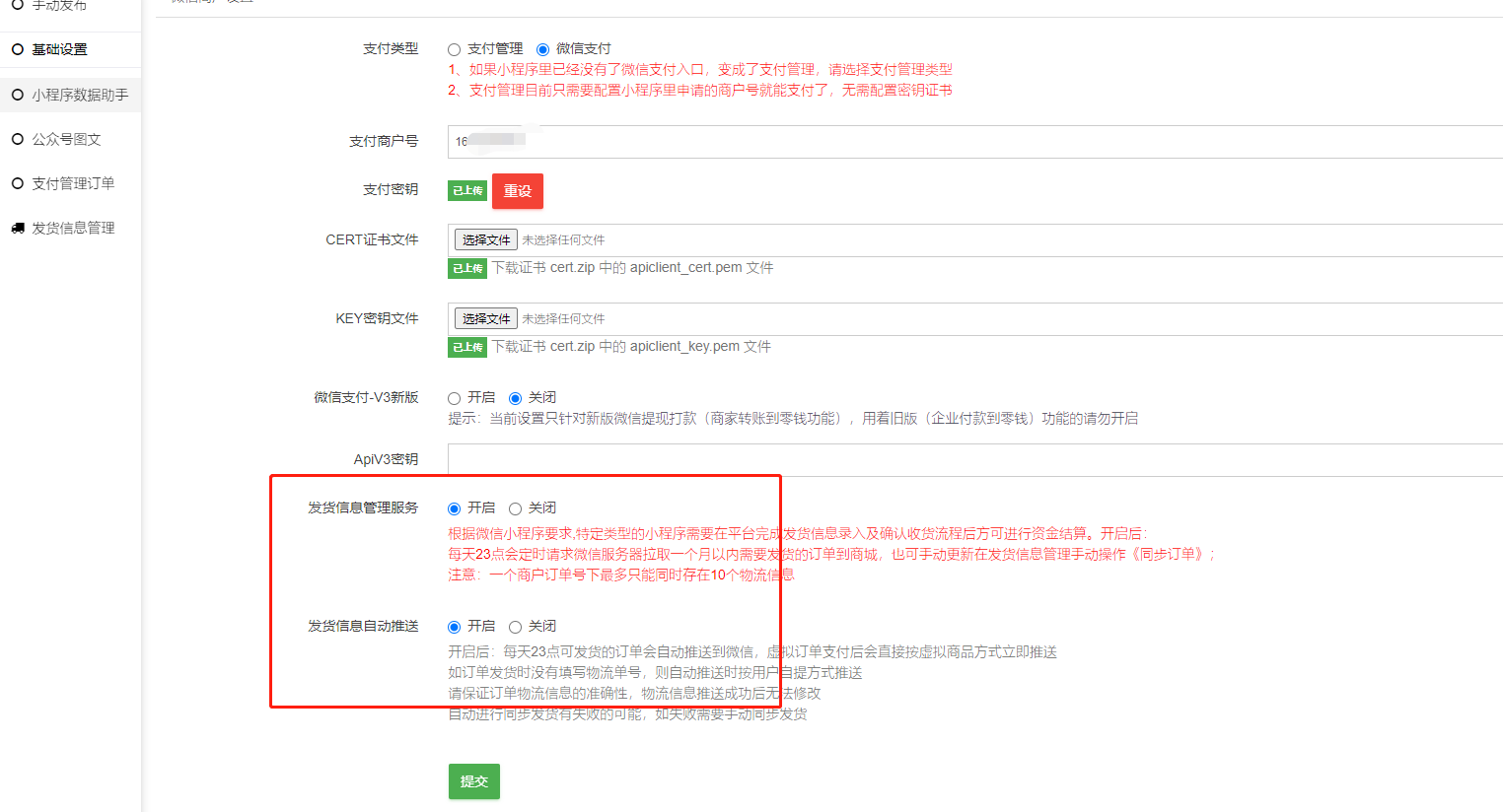 5、发货信息管理服务:如小程序有开通发货信息管理的,需要开启好~