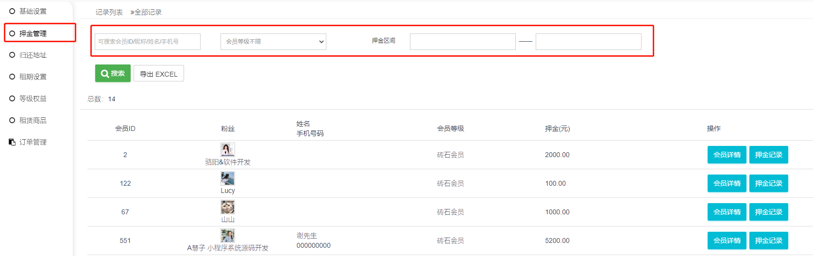 搜索筛选导出:通过会员信息、会员等级、押金区间搜索、筛选、导出押金记录。