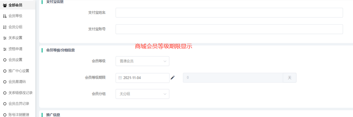 (4)等级有效天数:门店会员等级可独自设置,其门下会员按门店会员等级有效天数显示。不受商城平台会员等级有效天数设置影响。如下图。