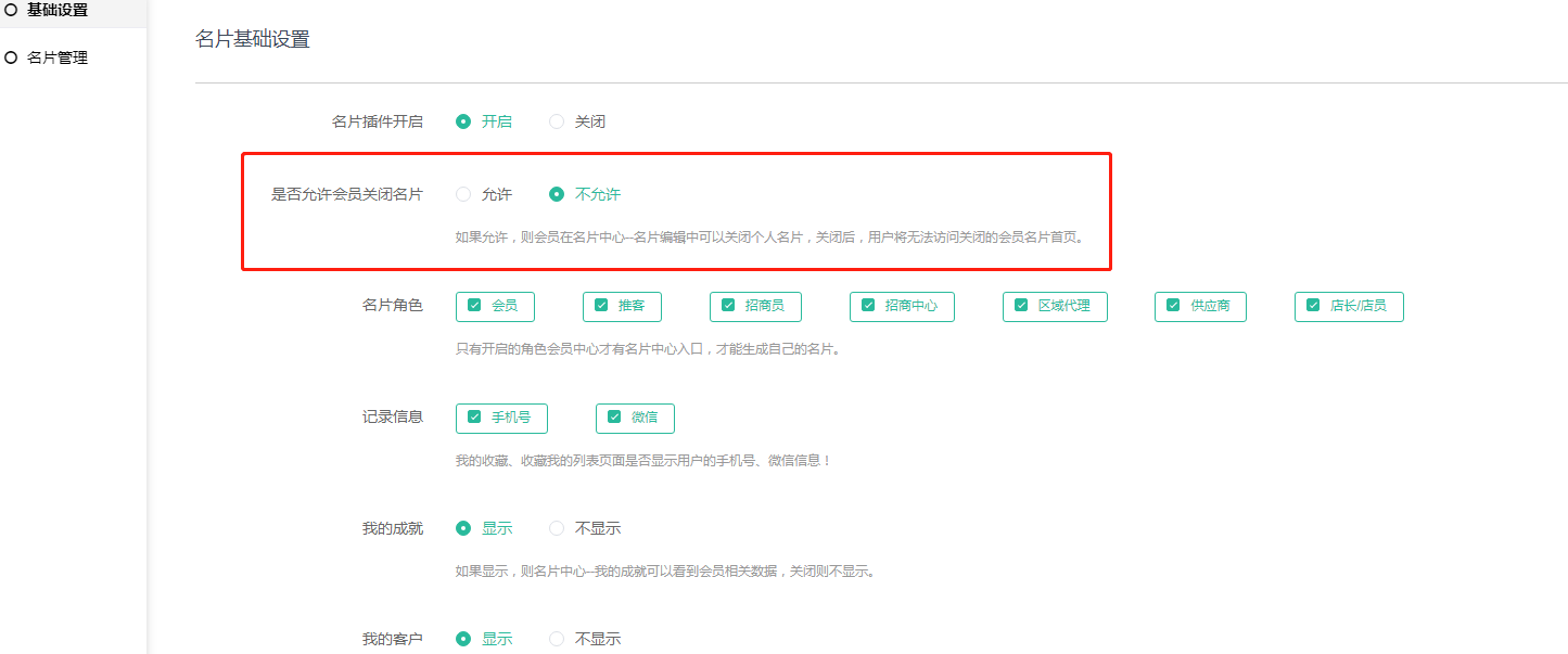 1)允许:则会员可以在前端名片编辑处关闭自己的名片,关闭后其他会员就无法访问自己的名片
